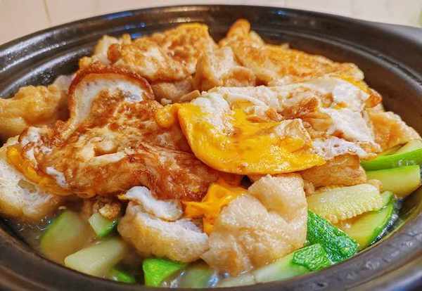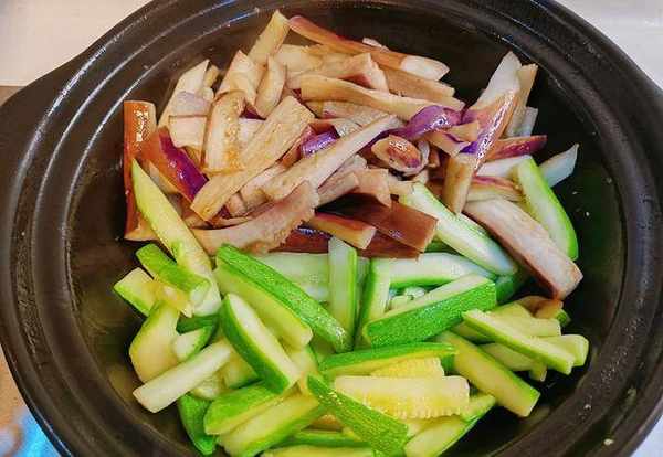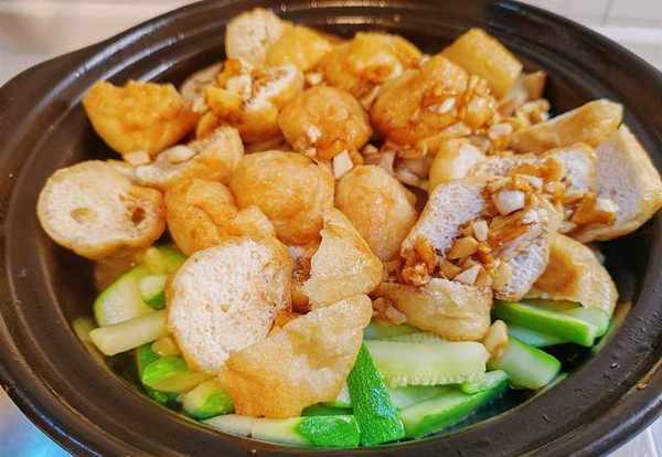 7、然後把切好的油豆腐泡也放入鍋中,平鋪在茄子和西葫蘆上面,再倒入調好的蒜香料汁後倒入少許熱水入一下味。