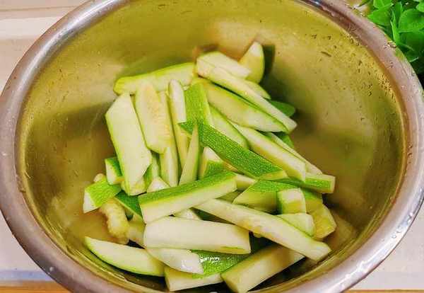 2、傢裡冰箱裡有一個西葫蘆,洗幹凈後去蒂去尾切成小條,裝入盆中加入少許鹽搓揉可以減少西葫蘆裡面多餘的水分,約10分鐘後需要沖洗掉鹽分備用。