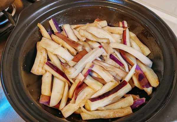 5、砂鍋熱後直接把茄子倒入鍋中煸炒至變軟,這樣的方法是為瞭讓茄子不會吸入太多油,吃起來不油膩,茄子變後倒入少許油爆香入味。