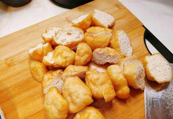 3、新鮮的油豆腐泡洗幹凈切成小塊,這樣燉的時候更加入味。多吃豆制品補充蛋白質,增強體質防感冒。