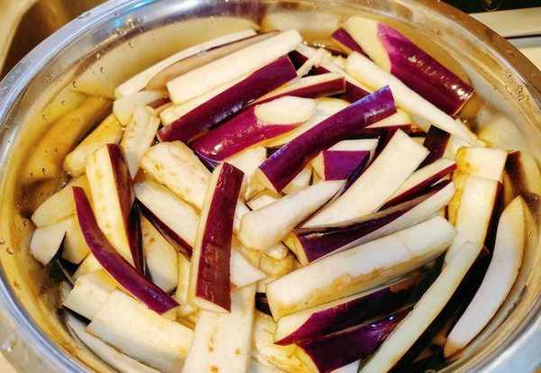 1、茄子沖洗幹凈去蒂去尾,按照自己喜歡的方式切成小條或者小塊,這個沒有什麼講究。把切好的茄子放入盆中加入少許鹽搓揉均勻醃制一會,這樣的方法可以讓茄子快速變軟,約10分鐘後再倒入清水沖洗掉多月的鹽分備用。