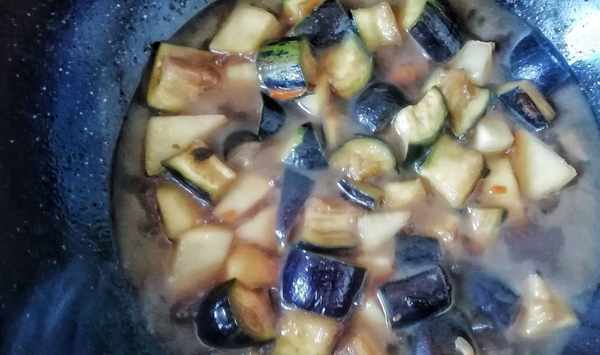⑤倒入準備好的茄子,再加入一碗清水,大火燒開後,轉小火慢燉,直至土豆熟透。