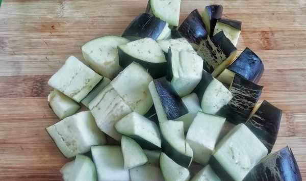 ③茄子去蒂,表層用水清洗幹凈,不需要去皮,茄子皮的營養非常豐富,用刀切成小塊。