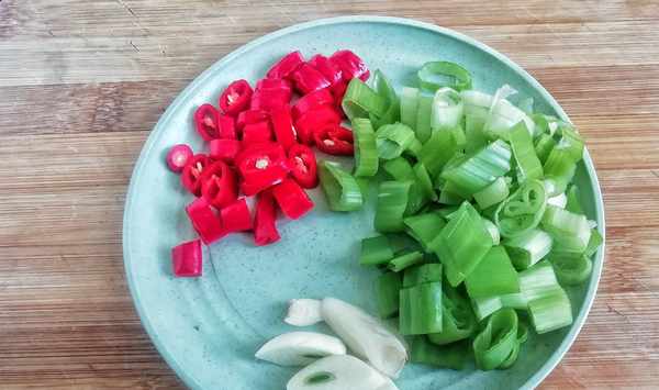 ①大蒜、香蔥、小米椒清洗幹凈,小米椒切圈,香蔥切段,大蒜切片,備用。