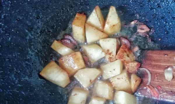 ④鍋中倒入適量的食用油,油熱以後倒入蒜片,爆出蒜香。然後倒入土豆翻炒,加入一勺生抽,適量的食鹽、雞精,翻炒均勻,大約30秒的時間。