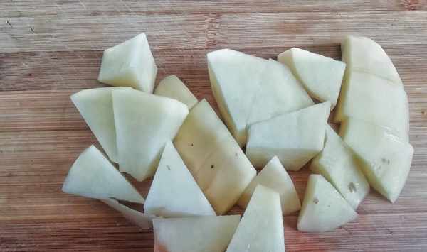 ②土豆去皮,切成滾刀狀,裝盤備用。
