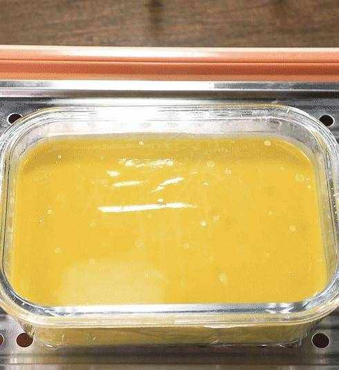 3.模具底部墊矽油紙,倒入南瓜面糊,蓋保鮮膜紮孔。