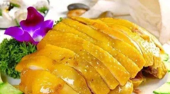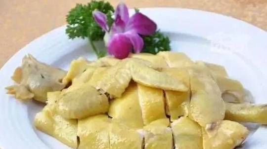 白切雞又名白斬雞,顏色潔白帶油黃,具有蔥油香味,用白水煮熟後蘸醬吃。雞肉的原味跟醬料結合在一起,非常爽口。