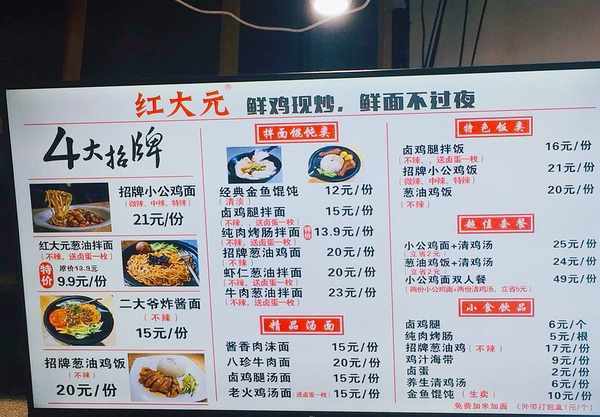 紅大元裏的四大招牌,除了辣爆小公雞面,還有金魚餛飩、秘制大雞腿面和上海蔥油拌面。老闆在每一種菜的配料上都極盡嚴苛,甚至每種配料使用量都要精確到0.1克,老闆說只有這樣才能保證品質,而且每道菜他都反復品嘗測試到上百次。
