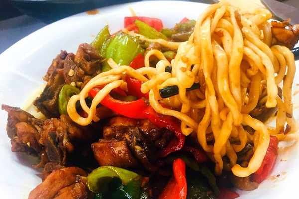 麵條純手工製作,厚、粗、而且很有勁道,分量特別的足,如果一比特男士吃的話,一份應該富富有餘,女生的話還是兩人吃一份比較好。雞肉塊每一塊都非常鮮嫩入味,吃的時候一定要充分拌勻,底部的湯汁能更好地裹在面的表面,一口一口鮮香甜辣十足,回味還略微有些花椒的香氣。搭配青紅椒一起吃也更好地讓一份看似比較幹的面顯得水分滿滿。
