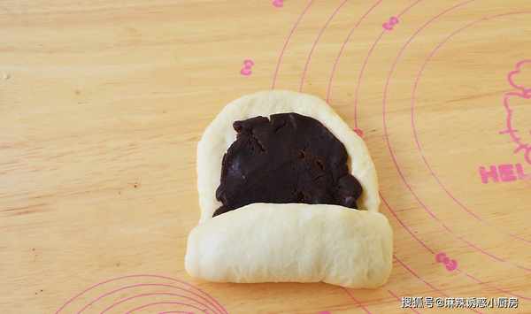 5、將面團取出揉勻排氣後分成相同大小的5份面團,揉圓蓋上保鮮膜醒發15分鐘,取一塊小面團搟成長舌狀,放入豆沙,再由下往上卷起收口捏緊