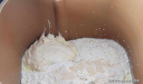 2、首先將純牛奶倒入面包機桶中,加入全蛋液、糖和鹽對角放,再加入高筋面粉、酵母,最後把發酵好的波蘭種加入,啟動和面程序,全程10分鐘