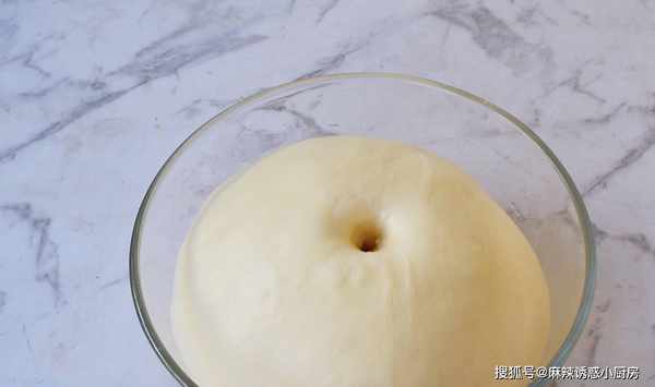 4、將面團取出揉圓,放在溫暖處發酵40分鐘,發酵好的面團是原來的兩倍大,用手沾面團戳面團一小洞,不回縮不反彈即為發酵成功