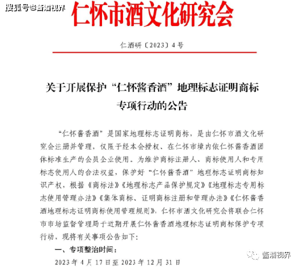 4月4日,仁 懷 市酒 文化研究會發佈通知,將於4月17日至12月31日,聯合市場監督管理局開展仁懷醬香酒地理標志證明商標保護專項行動。 內容主要包括: (一)查處未經許可,擅自 在產品和包裝上使用“仁懷醬香酒”地理標志商標標識和地理標志專用標志的行為; (二)查處使用與地 理標志證明商標或專用標志相近、易產生誤解的名稱或標識以及可能誤導消費者的文字或圖案標志等行為; (三)規范已許可使用但不規范使用“仁懷醬香酒”地理標志商標標識和地理標志專用標志的行為; (四)其他各類侵犯仁懷醬香酒地理標志證明商標行為。