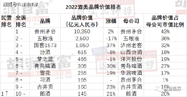 近日,胡潤研究院發佈《 2022胡潤品牌榜》。 此次發佈的榜單中,共有3傢酒企排 名前十,分別為貴州茅臺、五糧液、國窖1573。 其中,貴州茅臺以10350億元品牌價值排名總榜單第一,較去年增長250億元。 這是貴州茅臺連續第五次成為“最具價值中國品牌”,也是榜單上唯一 的萬億級品牌。