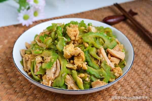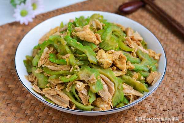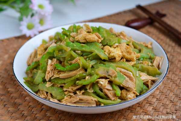 苦瓜含豐富的維生素C、鈣、鐵等營養素,還含有豐富的粗纖維,味苦卻清甜脆嫩,有清熱、滋肝、明目的效果。苦瓜雖苦,卻隻苦自己而不影響同炒的食材。腐竹是豆制品,富含蛋白質和鈣,其褶皺中能充分吸收湯汁,口感香彈。這道雞蛋腐竹苦瓜,蛋香、豆香、瓜香、椒香相托襯托又相互融合,不失為一道開胃又順氣的快手傢常炒菜。