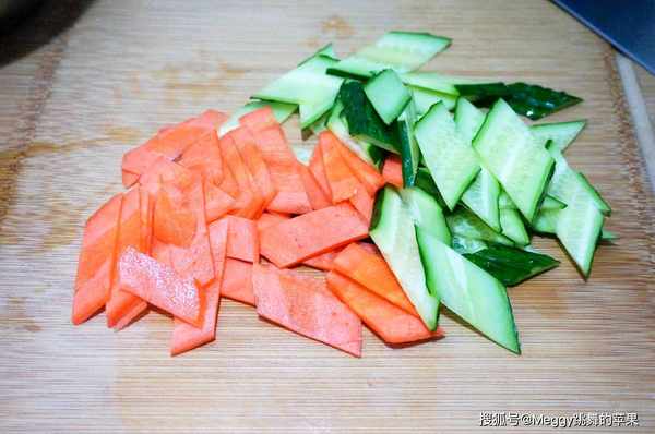 2. 胡蘿卜、黃瓜都能生吃,所以無需烹炒太長,盡量切薄片,加熱即熟;