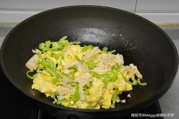 5. 辣椒和腐竹入鍋,中大火翻炒1分鐘,辣椒變軟,部分油脂浸入腐竹中;