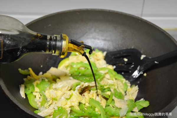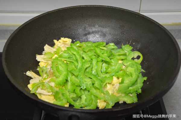 6. 倒入苦瓜,大火翻炒片刻;