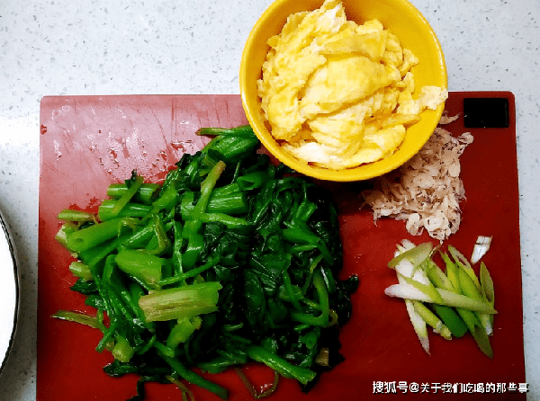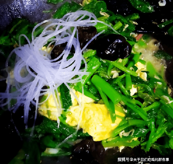 3、起鍋燒油,八成熱時倒入雞蛋液,大火煎一會兒,熟透後炒成大塊盛出。鍋裡留底油,放入蔥花、蝦皮爆香,倒入木耳炒一會兒,再放入菠菜、粉絲炒一會兒,加入適量食鹽、雞精調味,即可關火出鍋。