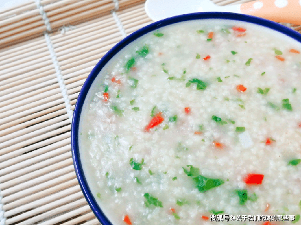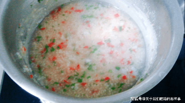 3、等到小米粥變得濃稠後,加入山藥丁、甜椒丁、生菜葉,加適量食鹽,用鏟子攪拌均勻後繼續煮10分鐘,加入幾滴香油提香,即可關火出鍋。