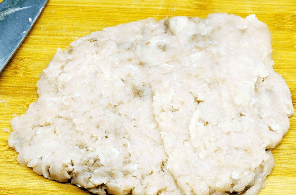步驟三:將鮁魚肉用刀剁碎,或者用勺子刮下來,挑出筋膜,用刀細細的碾壓一遍,再確定一下沒有刺後,用刀背將魚肉砸成肉泥。