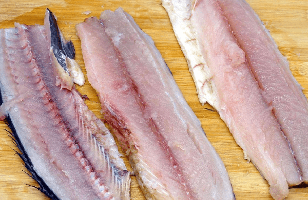 步驟二:鮁魚去頭鰓、內臟,切掉尾部洗凈。用刀將鮁魚兩邊的魚肉片下來,剔去魚皮。鮁魚肉上有2排小刺,用刀將這條帶刺的肉切除,用手仔細摸一下魚肉,確定沒有小刺瞭,用廚房用紙蘸幹水分,放在案板上備用。