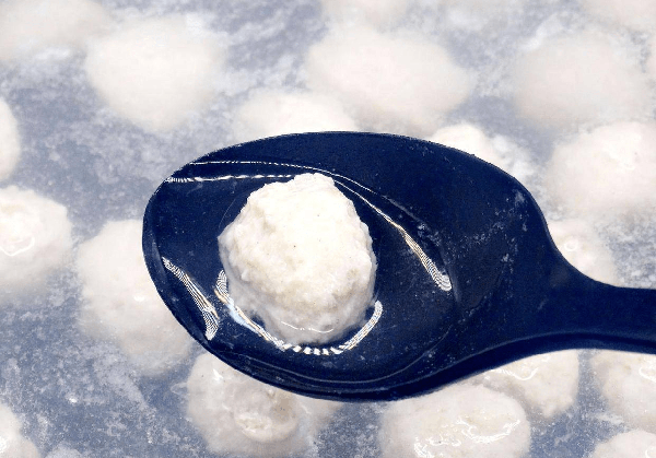步驟五:起鍋燒開水,然後轉小火保持火力,用勺子或者手的虎口處,將鮁魚餡擠成丸子下入水中,等丸子全部下入之後,轉成中火,水燒開之後,丸子漂浮起來,證明丸子已經成熟瞭,不需要用勺子攪動。將鍋中的沫子撇凈,撈出丸子放入盤中備用。