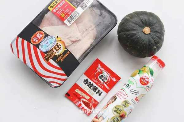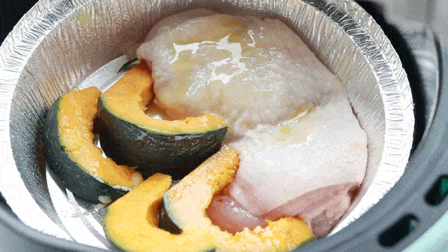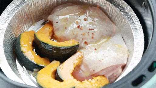雞腿排和貝貝南瓜是最常吃的搭配。雞腿排提前用一咪咪鹽醃制幾分鐘,南瓜洗凈後直接切塊,放進錫紙碗裡: