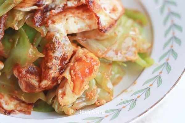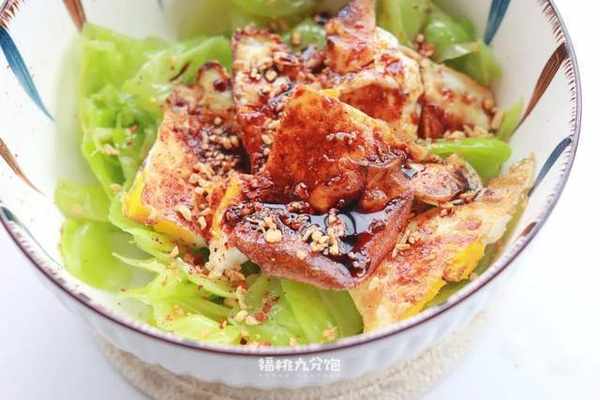 包菜隻用葉,根莖可以扔掉,切成塊後下沸水,煮到水再次沸騰後即可撈出;雞蛋嘛,用不粘鍋煎到全熟,也切成塊。