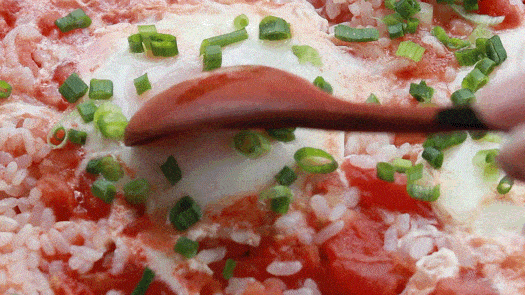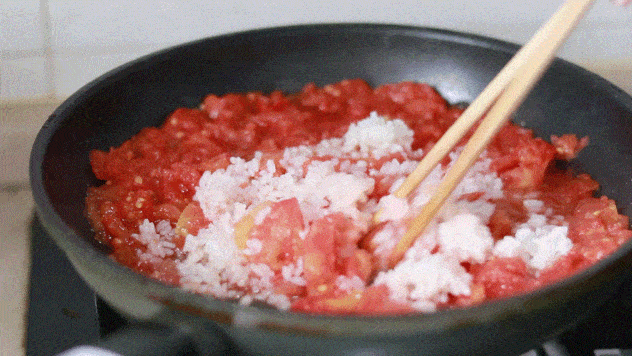 混合加熱後,加入隔夜米飯,本來幹硬的米飯慢慢吸收瞭番茄精華,變得柔軟Q彈: