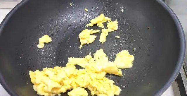 5.油倒出來,先將蛋煎熟,再用鐵鍬攪打成小塊,盛起。