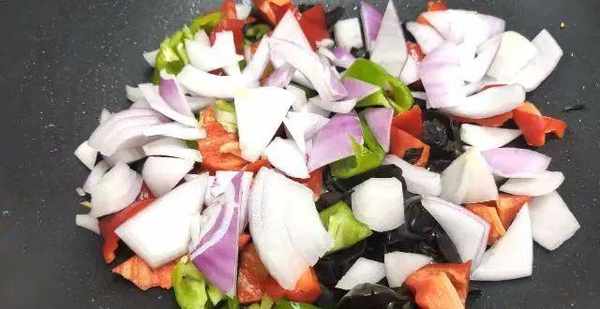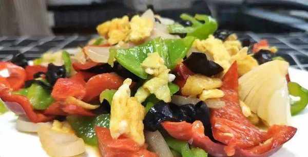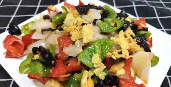 洋蔥1個,雞蛋2個,青椒1個,紅椒1個,木耳1小把。