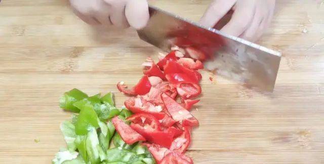 2.再備好1個青椒和1個紅椒從中切也切滾刀塊。