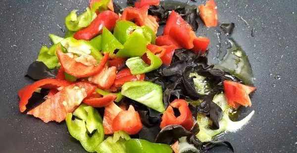 6.再倒油後加入青、紅椒塊和木耳炒1分鐘。