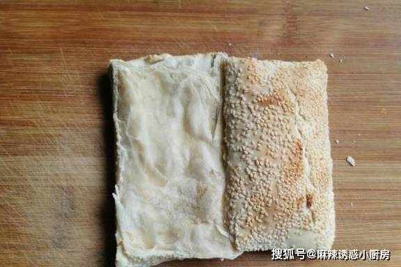缸爐燒餅從中間切開,缸爐燒餅是我們當地特有的,形狀四角長方形,鼓脹焦黃,層層皮薄,酥脆清香