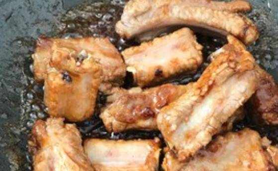 炒鍋裡面再次放入適量的食用油,接著放入一把冰糖,然後去攪拌,將冰糖炒化,炒出糖色,放入排骨一直翻炒,讓其上色。