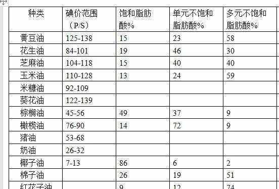 大量攝食飽和脂肪酸高的食品,比較容易罹患心臟血管疾病。而碘價數值愈小的食用油表示油脂飽和度愈高,也愈安定,較適合高溫油炸。油中所含三種比例脂肪之總和不為100,乃因尚含其他少量物質,不飽和脂肪酸包括單元不飽和及多元不飽和脂肪酸,多元不飽和脂肪酸含量愈多,氧化安定性愈差。