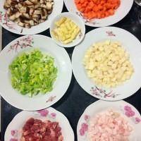 1.配料:香菇切丁,胡蘿卜切丁,蔥切丁,豬肉和脂肪切丁,生薑切丁,黑木耳泡發切末(我沒有上圖)。準備使用