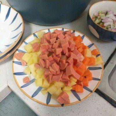 2.將柿子椒、洋蔥、土豆、胡蘿卜和火腿切成丁,放在盤子裡備用