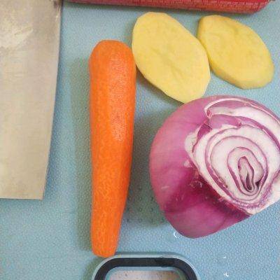 1.準備好所有必要的食材,去皮洗凈,土豆、洋蔥、胡蘿卜、火腿腸、豬肚、蔥花、香菜