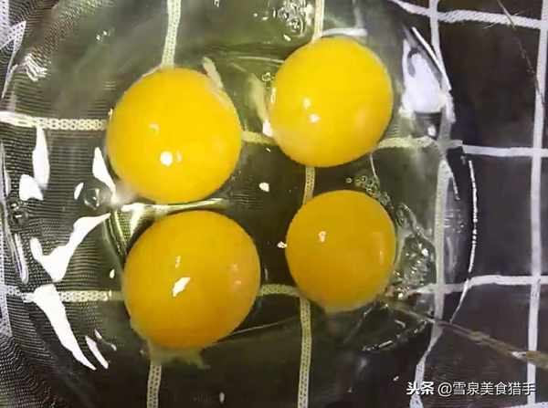 第一步是準備幾個生雞蛋,將它們倒入碗中,攪拌均勻。