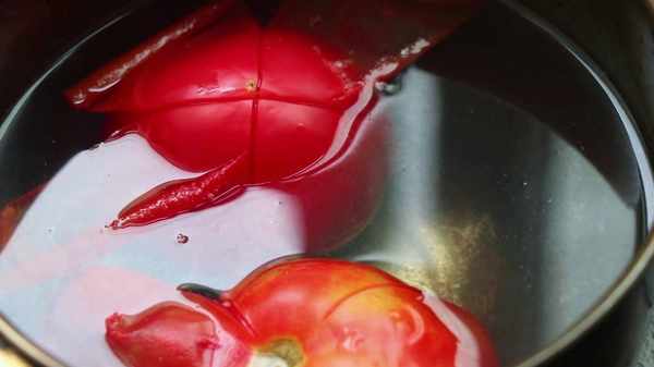 首先,將十字刀的番茄符號放入水中,煮沸。去皮並切成丁。