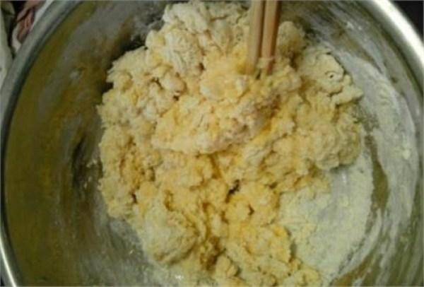 1個雞蛋和面條,不加水,用筷子攪拌成雪花。