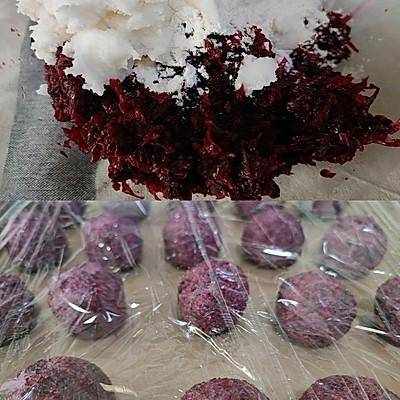 2.將玫瑰醬捏幹,與煮熟的低粉糯米粉豬油(或黃油、椰子油,你喜歡)混合均勻(戴上帶粘性的一次性手套),平均分成20塊,揉捏(每個約30克),蓋上保鮮膜,在冰箱中冷凍約半小時。