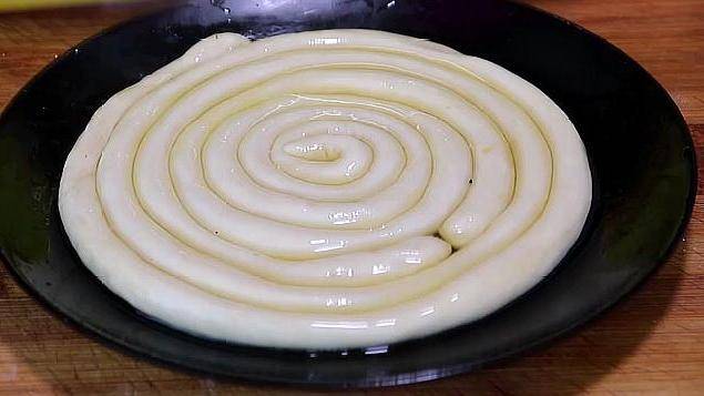 4.取出發酵好的面團,將其揉成兩半,然後將其揉成長條狀。在揉條的同時撒上一點幹面粉,以防止條和砧板之間粘連。然後我們拿一個空盤子,在上面刷上食用油。然後,我們將準備好的條狀物放在盤子上,並在表面刷上油。蓋上保鮮膜,發酵20分鐘。