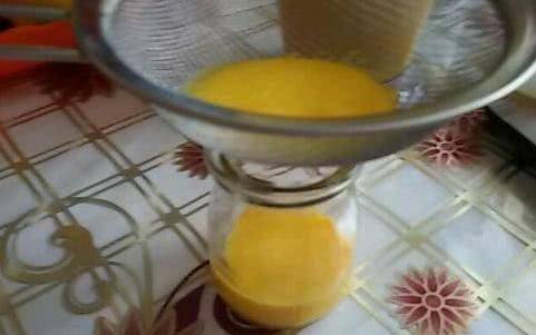 四。自然冷卻後,將牛奶倒入牛奶芒果泥中,攪拌均勻,然後倒入我們事先準備好的容器中,但倒入容器時要記得使用濾網。