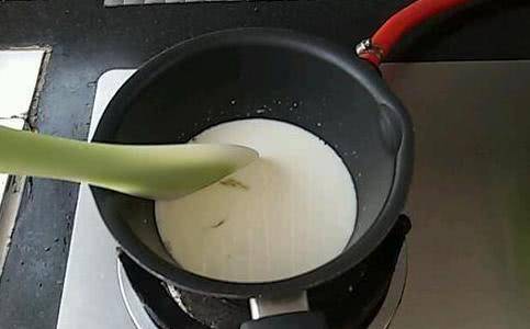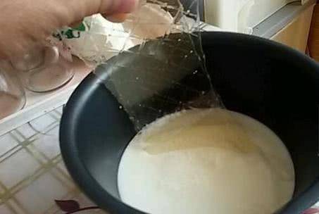三。然後把準備好的純牛奶和鍍金片煮沸。記得要一直攪拌,以免粘在鍋上。最後,加入適量白糖,攪拌均勻。此時,鍍金片也應完全開啟。把火關掉,讓它冷卻備用。