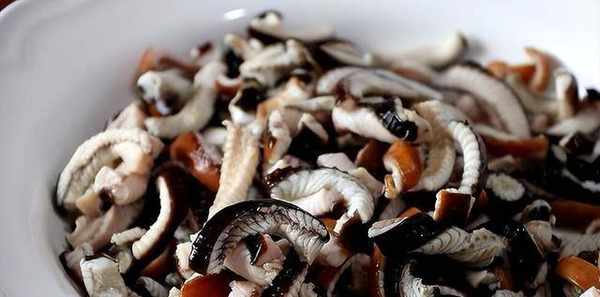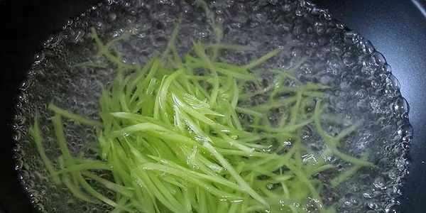 4、再將切成細絲的鱔魚絲放入熱水中,加入料酒焯一下水;