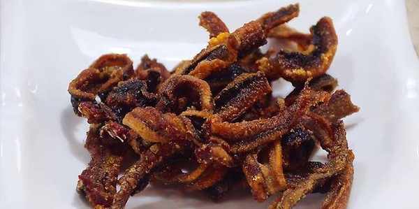 5、炸至鱔魚變的半透明狀且微微蜷縮,表面微微變皺,就可以撈出;